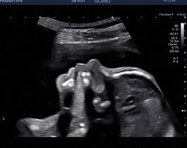 Das Ersttrimesterscreening wird bei uns standardmäßig mit der Untersuchung des fetalen Nasenbeins, mit dem Zufluß zum fetalen Herzen (Ductus venosus), einer frühen Beurteilung des fetalen Herzen, der frühen Beurteilung des fetalen Gehirns (ZNS) und mit den zuführenden Gefäßen zur Gebärmutter (Aa. uterinae) durchgeführt.